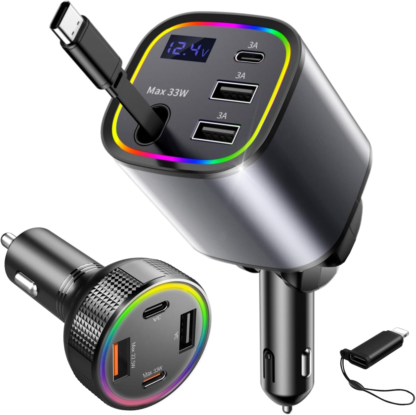 | Additional Features | 180 ° Rotatable Retractable Car Charger Fast Charging; 3 Port Usb A1/ A2 Outlet Usbc Outlet ; USB C Cable With C to L Adapter ; Retractable USB C Cable + USB C Port + USB A1 /A2 Port + C to L Charger Adapter ; Compatible with multiple 12-24V Cars ;Real time voltage display: Over-current protection ;Over-load protection ;Over-heating protection ;Short-circuit protection;, 4 In 1 Usbc Car Charger for Iphone Android Car Charger With Type c Cord, Fast charge Usbc Car Charger With Type c Cord ; Usbc Car Charger With RGB Color Light ; 180° Rotatable |