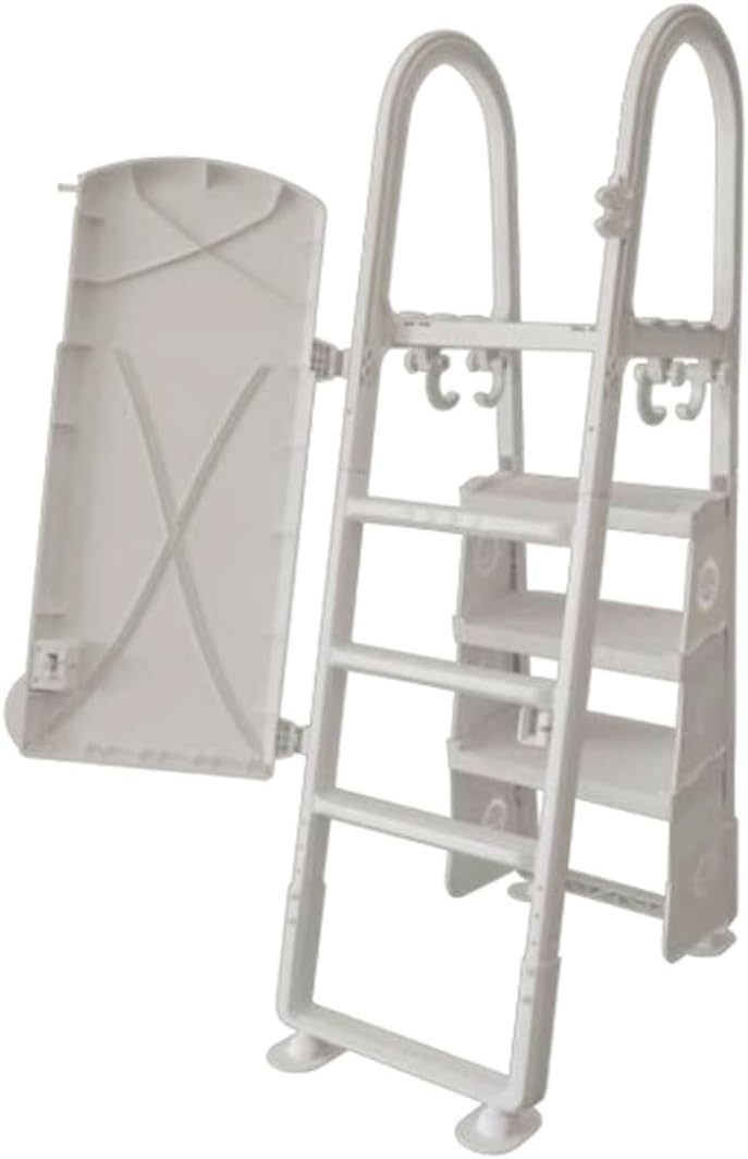 This ladder offers safety and adaptability for any above-ground pool ranging from 48" to 54" without a deck. The side barriers attach to the submerged steps to create an anti-entrapment barrier to prevent swimmers from entering behind the steps. The outer ladder features a self-closing and self-latching gate that with prevent unauthorized entry when your pool is not in use. Features: For 48" 52" or 54" pool walls Full Product Dimensions: 48" x 29" x 12" Superior quality resin protective barriers and gate covering steps 250 lb limit NOTE: Color May Vary Not for Intex, Bestway, or similar-style pools