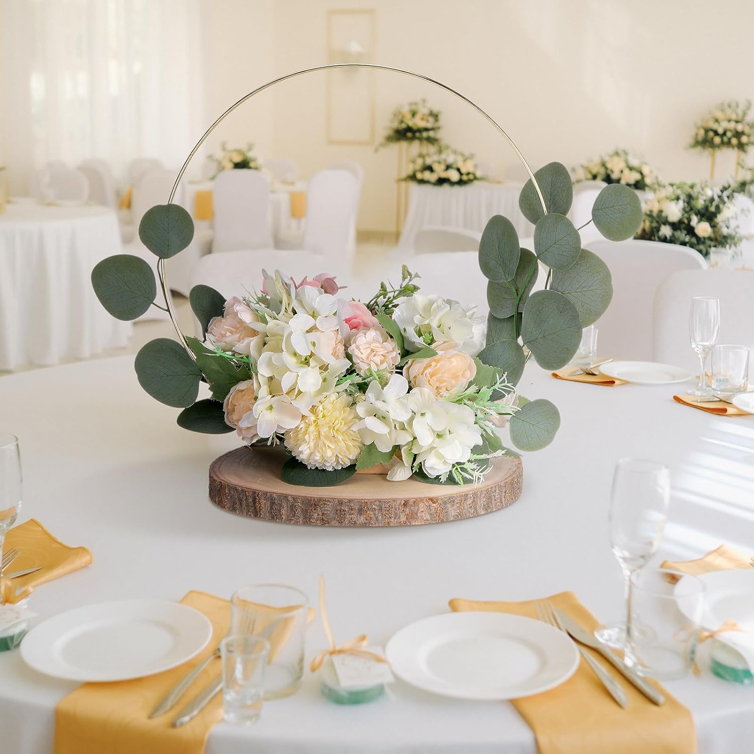 Features: Attaching the metal hoops to the stable wooden bases is effortless, allowing you to focus on the fun part, decorating. DIY the look by adding textures and colors that align with your theme, resulting in a distinctive piece for your event. The use of natural paulownia wood and metal ensures that the centerpiece set not only looks nice, but is also has natural Aesthetics. Specifications: Material: wood and metal Color: gold Size: Metal floral hoop: 12 inches in diameter, 0.12 inches thick Wooden stand: 2.7 x 1.6 x 0.8 inches Wooden slices: 9-10 inches in diameter, 0.8 inches thick Package includes: Package includes: 6 x Metal floral hoop centerpiece with wood stand 6 x Natural paulownia wood slices Notes: Manual measurement, please allow slight errors on size. The color may exist a slight difference due to different screen displays